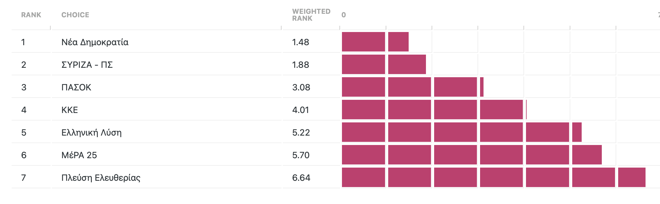 Την σειρά κατάταξης των κομμάτων πέτυχαν σε συντριπτικό ποσοστό οι αναγνώστες της «Ημερησίας» στο διαδικτυακό poll που έτρεξε από το πρωί στον ιστότοπο της «Η». Οι κάλπες έκλεισαν στις 07:00 το απόγευμα και οι πολίτες σε όλη την Ελλάδα ψήφισαν για τις εκλογές της 21ης Μαίου 2023.