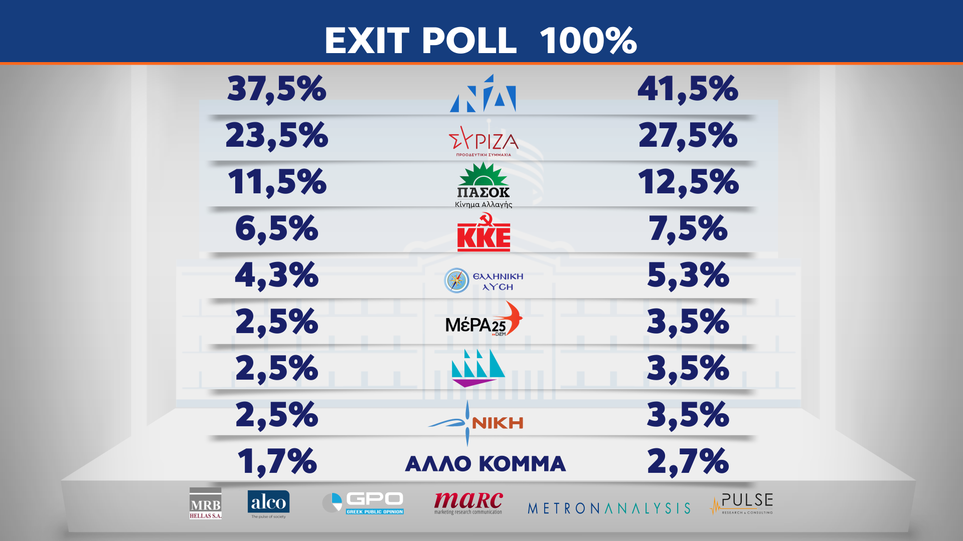 Το κοινό exit poll, που διενεργήθηκε από τις εταιρίες δημοσκοπήσεων ALCO, MARC, METRON ANALYSIS, MRB HELLAS A.E., Pulse και GPO παρουσιάστηκε ταυτόχρονα από όλα τα ελληνικά τηλεοπτικά δίκτυα.