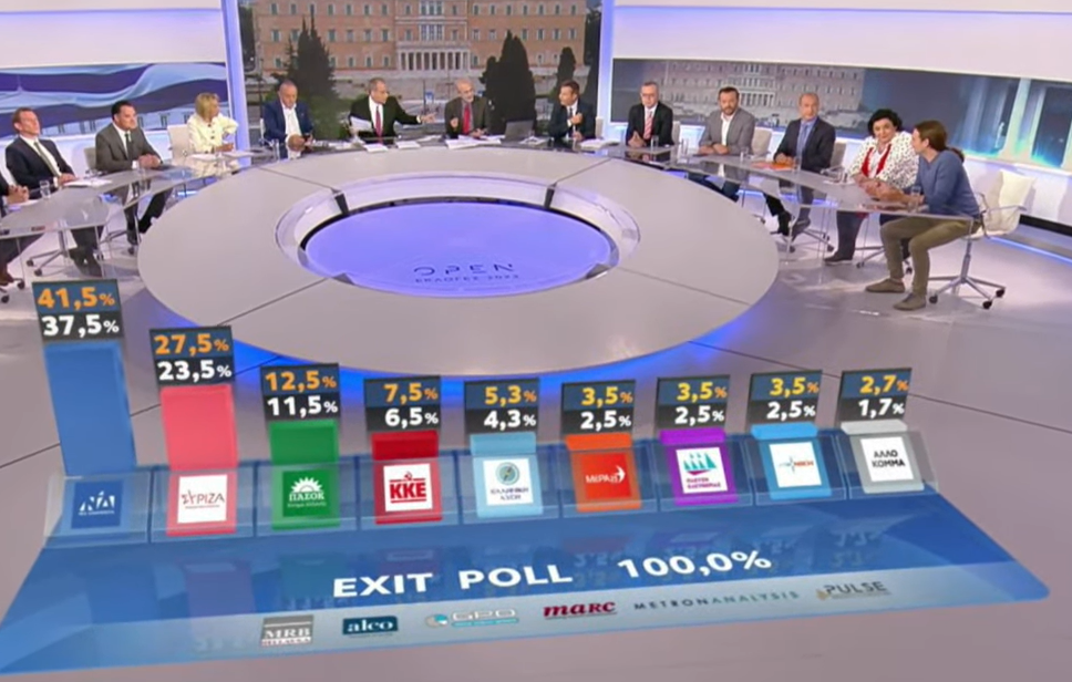 Αυξάνεται το προβάδισμα της ΝΔ έναντι του ΣΥΡΙΖΑ, σύμφωνα με το νέο διορθωμένο exit poll που παρουσίασε μόλις το OPEN, σχεδόν μιάμιση ώρα μετά το κλείσιμο της κάλπης των βουλευτικών εκλογών της 21ης Μαΐου. Το ποσοστό του ΠΑΣΟΚ εμφανίζεται επίσης ενισχυμένο. Τα τελικά ποσοστά που δείχνουν τα exit poll :