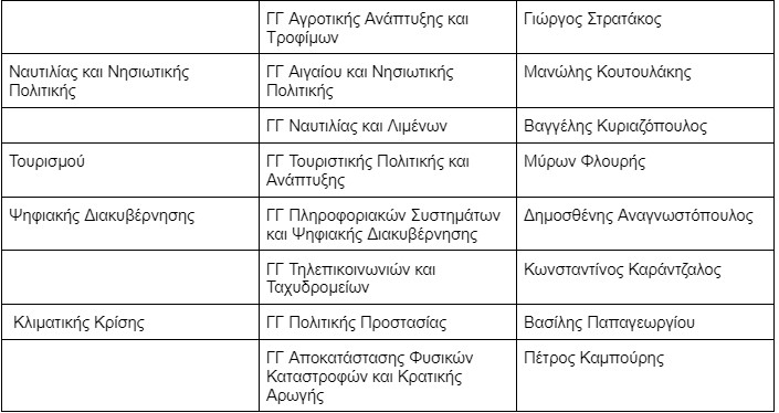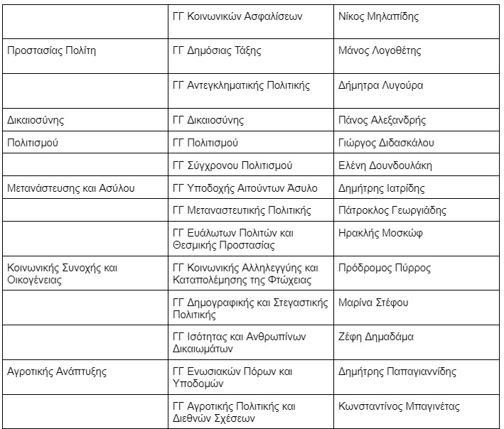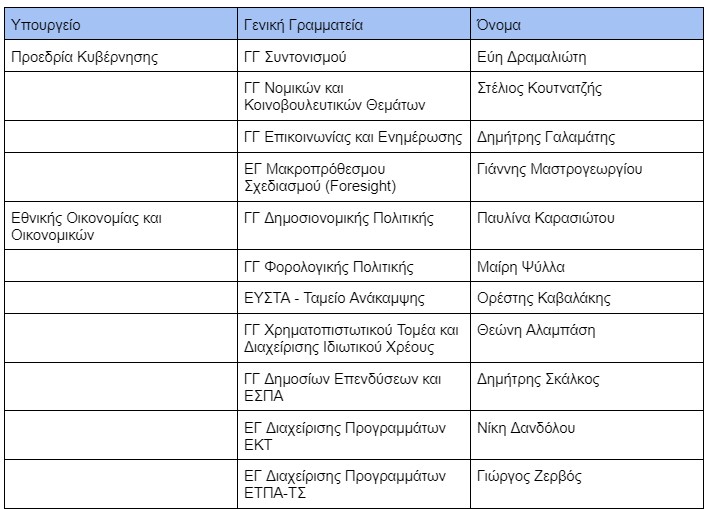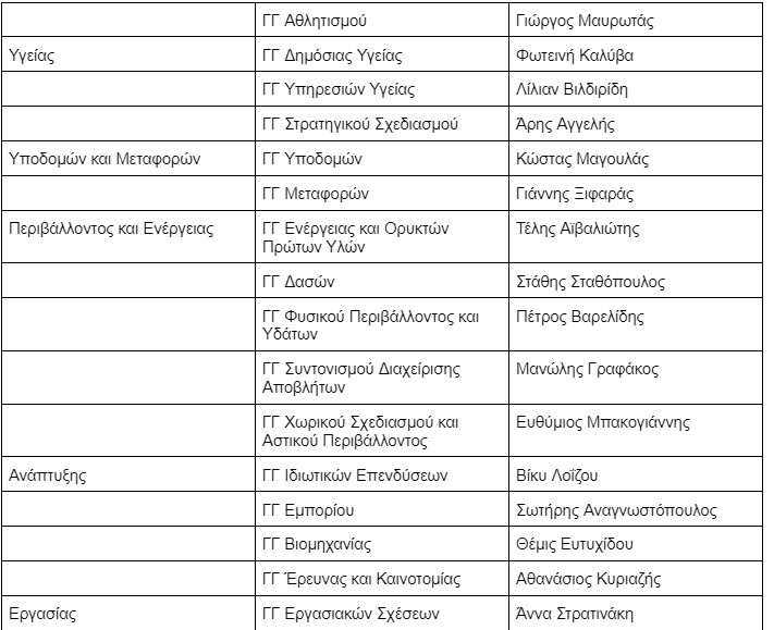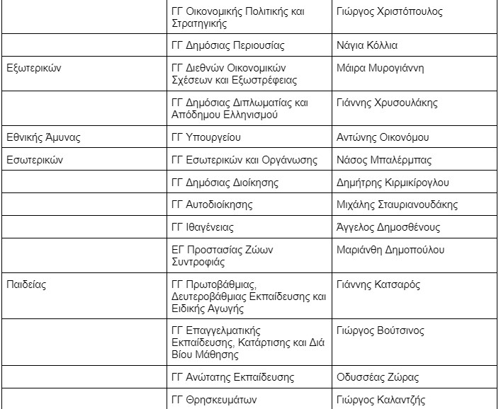 Από το σύνολο των 63 Γενικών και Ειδικών Γραμματέων, οι 34 (54%) παραμένουν στη θέση που κατείχαν, ενώ οι 29 (46%) είναι νέες