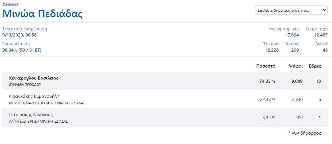 Πανηγυρική εκλογή από τον πρώτο γύρο των αυτοδιοικητικών εκλογών 2023, πέτυχε στο δήμο Μινώα Πεδιάδας του νομού Ηρακλείου, ο πρώην βουλευτής του ΠΑΣΟΚ, Βασίλης Κεγκέρογλου.