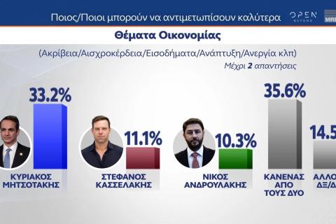 ΠΟΛΙΤΙΚΗ 02.11.23 20:26 Δημοσκόπηση MRB για Οpen: Νούμερο 1 πονοκέφαλος για τα νοικοκυριά η ακρίβεια – Κυρίαρχος ο Μητσοτάκης - Μάχη ΣΥΡΙΖΑ με ΠΑ.ΣΟ.Κ Πώς αξιολογούν οι πολίτες Μητσοτάκη και Κασσελάκη