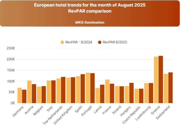 Αντίθετα, οι χειρότερες επιδόσεις καταγράφηκαν στη Γερμανία, με το RevPAR να υποχωρεί στα 61,4 ευρώ, καταγράφοντας πτώση 12,2% από τον περσινό Αύγουστο, καθώς η πληρότητα περιορίστηκε κατά 1,6 μονάδες. Αντίστοιχα, η Γαλλία, σε δυσμενή σύγκριση με τον Αύγουστο των Ολυμιακών Αγώνων του 2024, είδε τη μέση τιμή να πέφτει 15,8% και το έσοδο ανά δωμάτιο να αγγίζει τα 88,4 ευρώ, μειωμένο σχεδόν 18%.