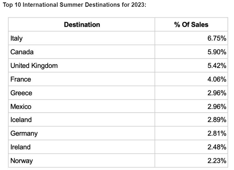 Η Ιταλία είναι ο πιο δημοφιλής διεθνής καλοκαιρινός προορισμός για τους Αμερικανούς, για δεύτερο συνεχόμενο καλοκαίρι με ποσοστσό πωλήσεων 6,75%, ενώ ακολουθεί ο Καναδάς με 5,9%, η Μεγάλη Βρετανία με 5,42%, η Γαλλία με 4,06%, ενώ την πέμπτη θέση μοιράζονται Ελλάδα και Μεξικό, με 2,96% και ακολουθούν Ισλανδία, Γερμανία, Ισλανδία και Νορβηγία.