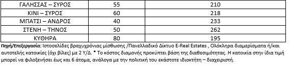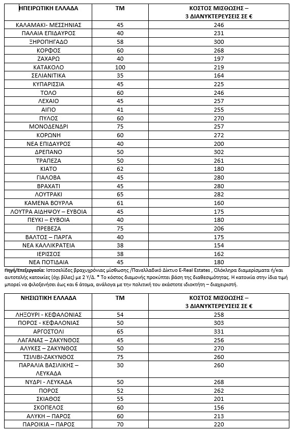 Στον Πόρο, κατοικία 52 τ.μ. κοστίζει 262€ για τρεις διανυκτερεύσεις, στην Σκιάθο 201€ και στη Σκόπελο, κατοικία 60 τ.μ., 156€ για τρεις διανυκτερεύσεις.