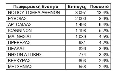 Οι 10 περιφερειακές ενότητες με τον μεγαλύτερο αριθμό ενεργοποιημένων επιταγών τον περασμένο μήνα.