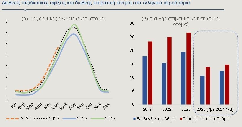 Επιπρόσθετα, ιδιαίτερα ενθαρρυντικές είναι οι ενδείξεις για τον Ιούλιο, με τις διεθνείς τουριστικές αφίξεις στον Διεθνή Αερολιμένα Αθηνών και στα περιφερειακά αεροδρόμια της χώρας να υπερβαίνουν τις αντίστοιχες περυσινές κατά 10,8% και 3,6% (Γράφημα 1β). Παράλληλα, η διαδικτυακή φήμη της Ελλάδας ως ταξιδιωτικού προορισμού εξακολουθεί να καταλαμβάνει μία από τις υψηλότερες θέσεις στην Ευρώπη. Συγκεκριμένα, σύμφωνα με την πορεία του δείκτη NSI , το δεύτερο τρίμηνο του έτους, η Ελλάδα μαζί με την Ισπανία κατατάσσονται στην τρίτη θέση μετά την Πορτογαλία που είναι πρώτη και την Ιταλία με την Κροατία που ισοβάθμησαν στη δεύτερη θέση.