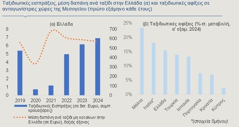 Επιπρόσθετα, πρόκειται για την τρίτη υψηλότερη ετήσια μεταβολή που καταγράφηκε το πρώτο εξάμηνο σε επιλεγμένες χώρες της Μεσογείου (Γράφημα 2β). Αξίζει, ωστόσο, να σημειωθεί ότι σε όλες τις ανταγωνίστριες χώρες που παρουσιάζονται στο γράφημα, η ετήσια μεταβολή των ταξιδιωτικών αφίξεων το πρώτο εξάμηνο του 2024 ήταν έντονα θετική, με τα ποσοστά αύξησης να είναι διψήφια για την Ισπανία, την Τουρκία, την Ιταλία και την Μάλτα. Το γεγονός αυτό συνάδει με τις προβλέψεις του διεθνούς οργανισμού World Travel & Tourism Council (WTTC) ο οποίος προβλέπει ότι το τρέχον έτος θα αποτελέσει νέα χρονιά ρεκόρ για τον παγκόσμιο τουρισμό.